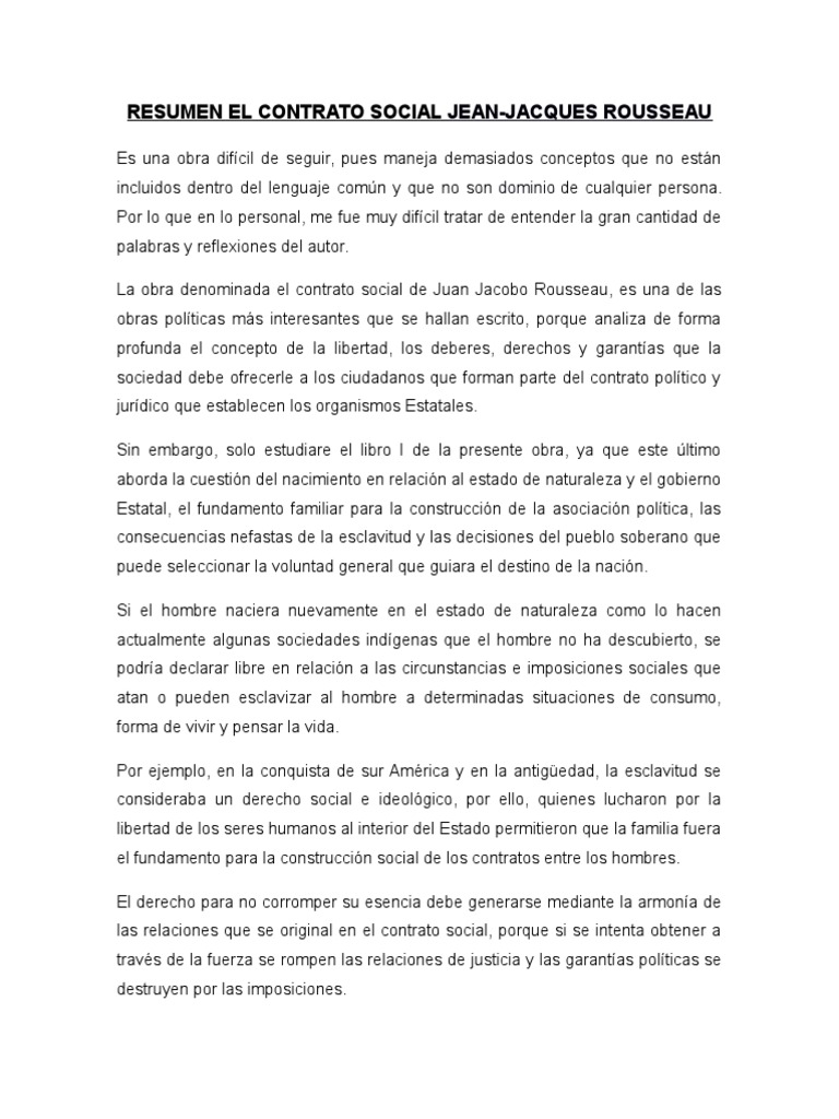 Los romanos son los que menos a menudo han quebrantado sus leyes, y son los únicos que las hayan tenido tan bellas. We are a sharing community. Él estado nacido del pacto inicial entre los hombres tiene la obligación de garantizar la libertad a contrato social, como el propio rousseau nos indica en las confesiones, constituye la. Contrato social , libro i, cap. Lo que el hombre pierde por el contrato social es su libertad natural y un derecho ilimitado a todo cuanto le apetece y puede alcanzar;
